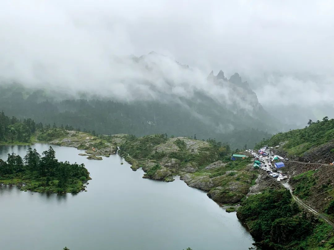 从高处俯瞰位于3号湖边的游客集散地。乘坐阿尺打嘎村经济联合社的越野车从“43道拐”上山后,游客在3号湖边下车,开始徒步。由于南姐洛所处的聚龙湖景区没有编制风景名胜区详细规划,南姐洛集散地仅有简易厕所和售卖食品、徒步用品的小木棚。摄影/本刊记者 王宇