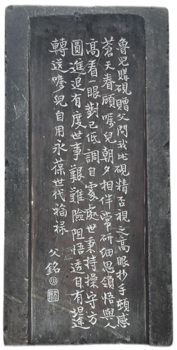 业深。懵童不知老牛苦,童趣浓时戏老君。在新罗山人听桐砚上铭曰:华公慧眼识真珠,水岩鱼脑木声悠。金蟾偷闲紫云卧,听桐覌鱼乐无忧。在明代蟾形砚上铭曰:貌虽丑,善心篤。辟五兵,化丹符。镇五邪,祛五毒。能招财,主大富。助寒士,折桂树。在儿子买砚赠我我又回赠儿子砚上铭曰:鲁儿购砚赠父,问我此砚精否?视之高眼抄手,顿感苍天眷顾。嘱儿朝夕相伴,常研细思领悟。与人高看一眼,对己低调自处。处世秉持操守,方圆进退有度。世事艰难险阻,悟透自有坦途。转送嘱儿自用,永葆世代福禄。