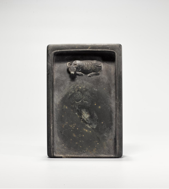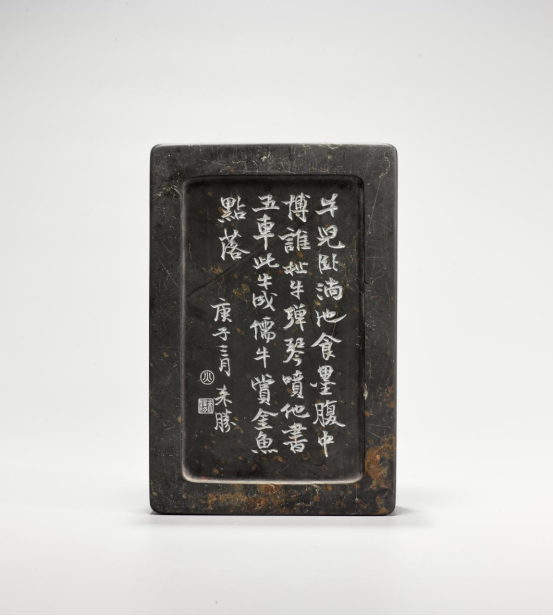 在一方歙石金晕卧牛砚上铭曰:牛儿卧淌池,食墨腹中博。谁扯牛弹琴,喷他书五车。此牛成儒牛,赏金鱼点落。