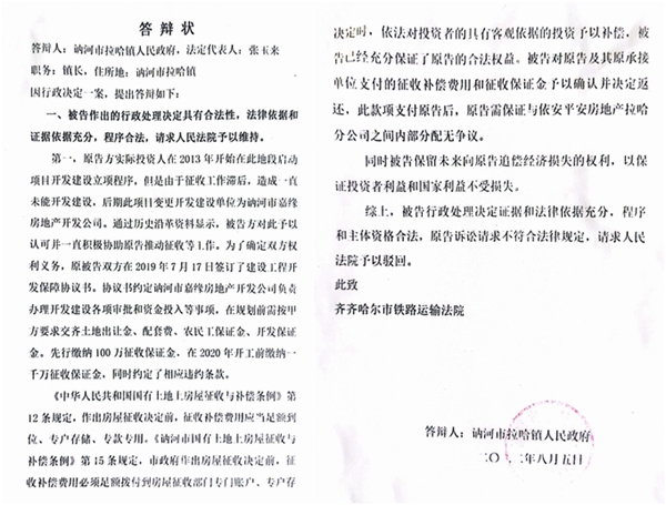 对于嘉缘公司所称的镇政府违约并起诉镇政府问题,拉哈镇政府则称是嘉缘公司违约,其至今未缴纳2000万元保证金,因此镇政府才做出的《决定》。其答辩书主要内容如下: