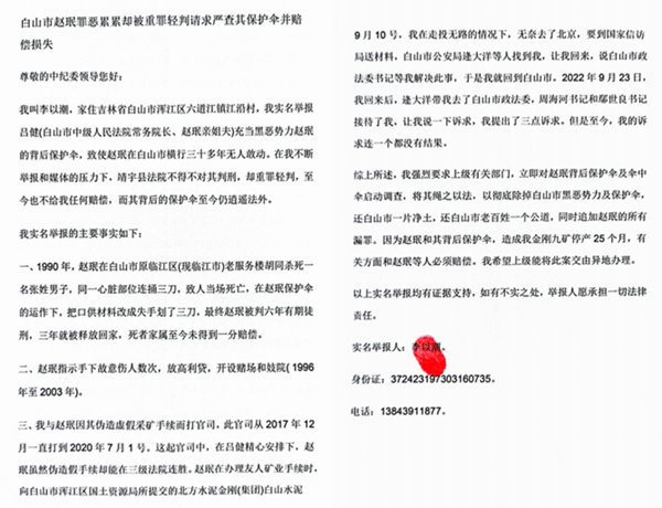 我叫李以潮,家住吉林省白山市浑江区六道江镇江沿村,我实名举报吕健(白山市中级人民法院常务院长、赵珉亲姐夫)充当黑恶势力赵珉的背后保护伞,致使赵珉在白山市横行三十多年无人敢动。在我不断举报和媒体的压力下,靖宇县法院不得不对其判刑,却重罪轻判,至今也不给我任何赔偿,而其背后的保护伞至今仍逍遥法外。