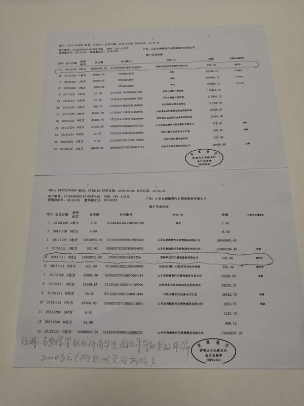 其三,济南华宝汽车销售服务有限公司、石某辉、辛某涛联合向我骗取2000万元。2013年,辛某涛虚构其朋友的公司——济南华宝汽车销售服务有限公司能够向我提供低价车辆,但需要我出资购买。我为了从华宝公司购入便宜车辆,便按照他们的要求自己联系了两家担保公司提供担保,以自有的公司(山东东洲德奥汽车销售服务有限公司)向交通银行进行贷款。