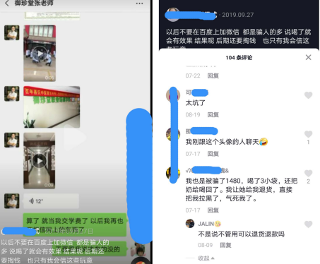而当这些宝妈们真的遇到问题和想咨询专业知识时,网络背后的“张老师”根本给不到相应的专业回答。据网友反映,部分饮用过御珍堂优哺汤的消费者根本没有效果或者效果不明显,想继续咨询如何进一步解决,这些网络背后的“张老师”就开始推销所谓的“优哺汤升级版”,要宝妈们继续消费,如果不继续购买产品,或者要求退款时,微信就会被拉黑,从此张老师就“人间蒸发”了。