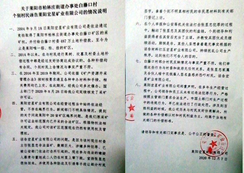 情况说明还写到,在2016年至2019年期间,公司依据《矿产资源开采管理办法》按时按要求递呈各种申办材料和手续,相关费用均已上交。再在此期间多次催办,国土部门于2020年8月28日延续核发了采矿许可证。公司在经营过程中始终依法经营,不存在越界行为。关于问政莱阳中20亩矿区越界问题,是我们原采矿许可证坐标范围内已开采的合法矿区,根据物权法相关规定,公司对该矿区范围仍然有使用权及管理权。