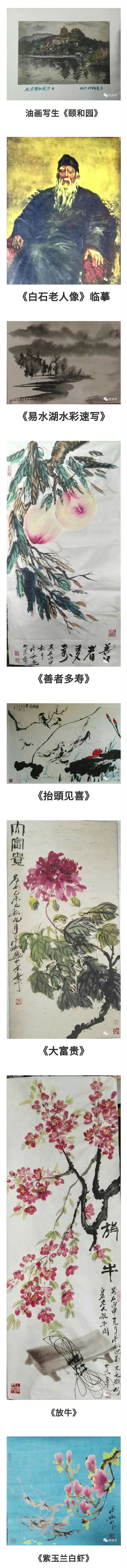 他还创作了《牡丹》《紫玉兰》《白猿献寿图》《牵牛花》,山水画作《长白山天池》《新疆秋色》,也创作过油画《九寨沟》等作品。经过多年的研究创作了紫玉兰,应北京市残联负责人黎强之约2014年为APEC会议创作了一幅长9米、高2米的巨幅画作,并获得国家知识产权局的产权证书,专利局为作品登记。