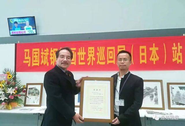日本大村市美术协会会长坂中淳先生为马国斌老师颁发日本大村市政府感谢状