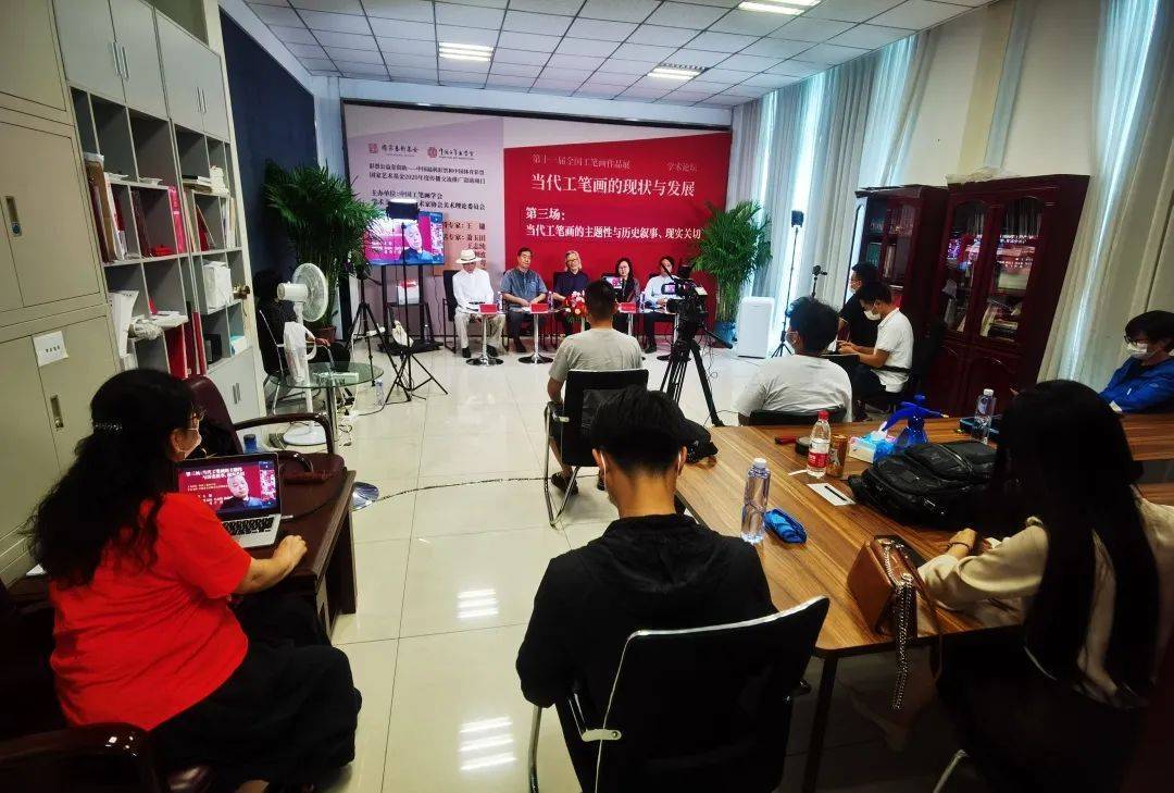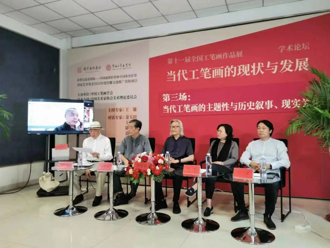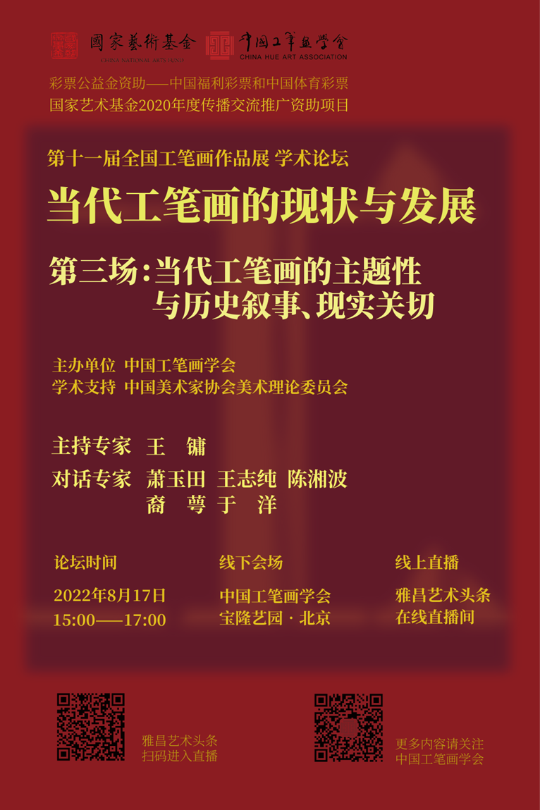 2022年8月17日下午,由中国工笔画学会主办、中国美术家协会美术理论委员会学术支持的,国家艺术基金资助项目“第十一届全国工笔画作品展”系列论坛“当代工笔画的现状与发展”第三场“当代工笔画的主题性与历史叙事、现实关切”,在中国工笔画学会成功举行。六位嘉宾结合“第十一届全国工笔画作品展”,就“主题性工笔画如何发挥画种的特性,工笔历史画如何利用历史叙事资源,现实题材工笔画如何表现现实关切”等大家关注的话题展开精彩对话。论坛合作的雅昌艺术头条直播吸引了近120万观众在线观看直播和回放。
