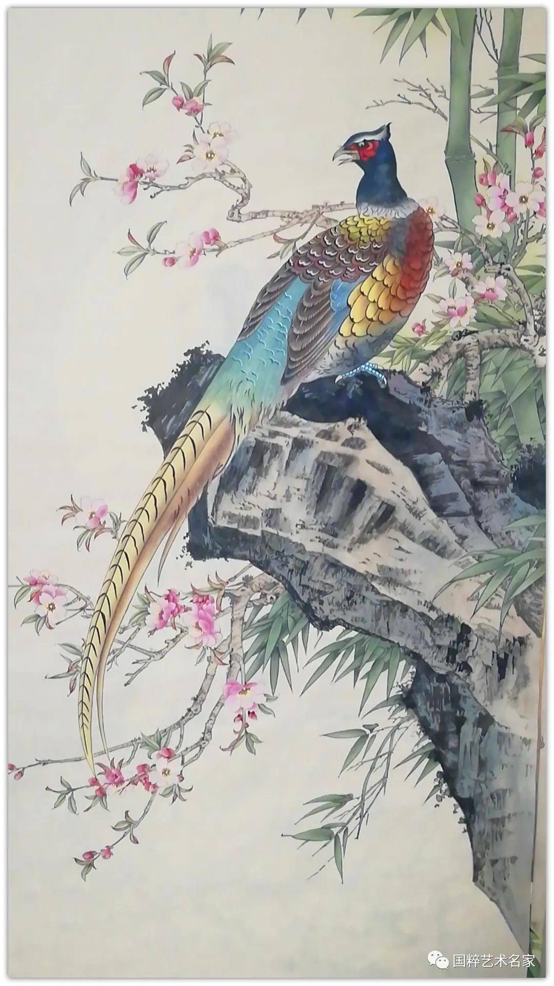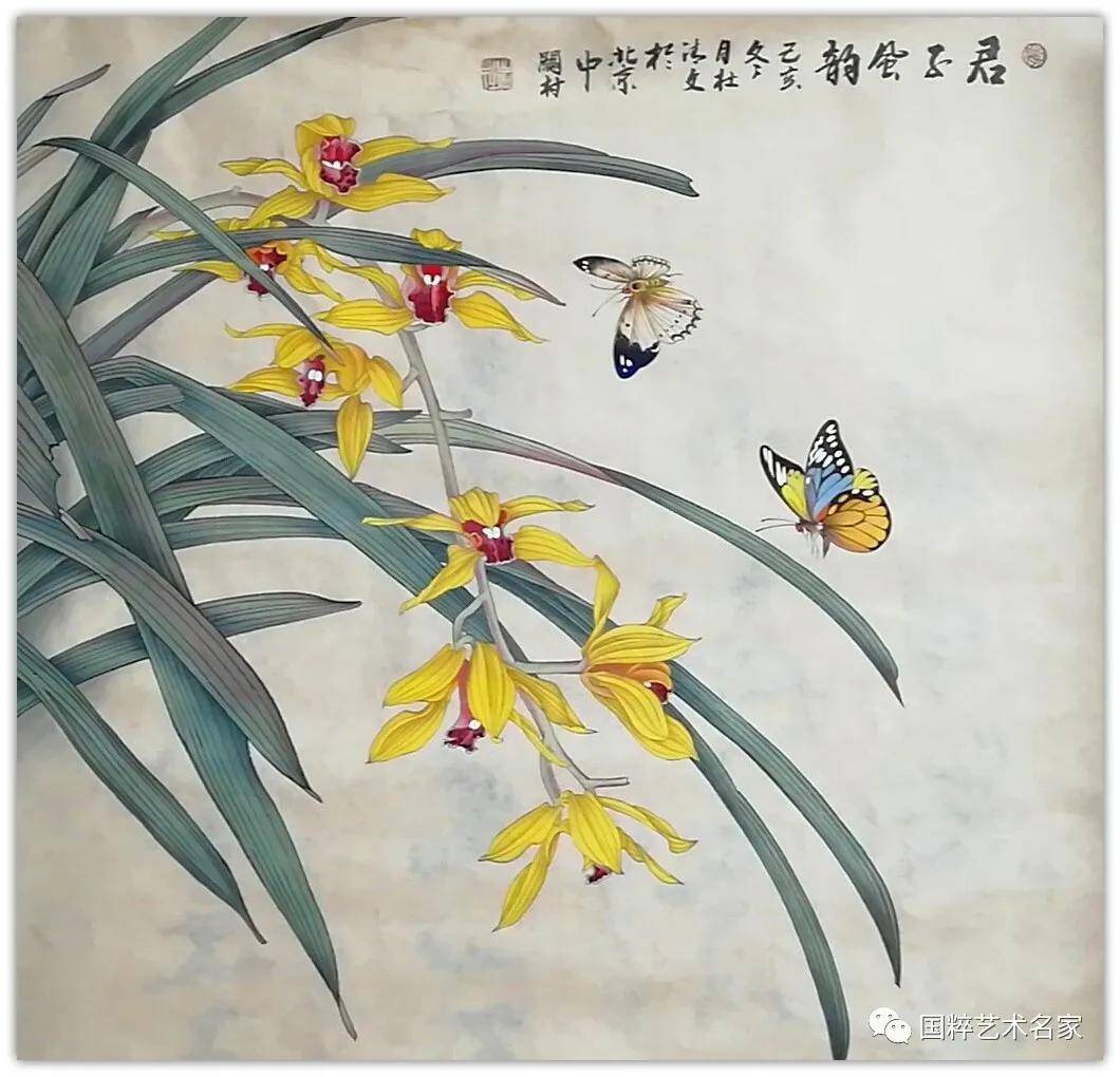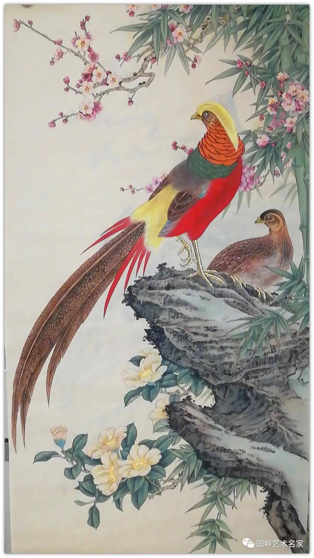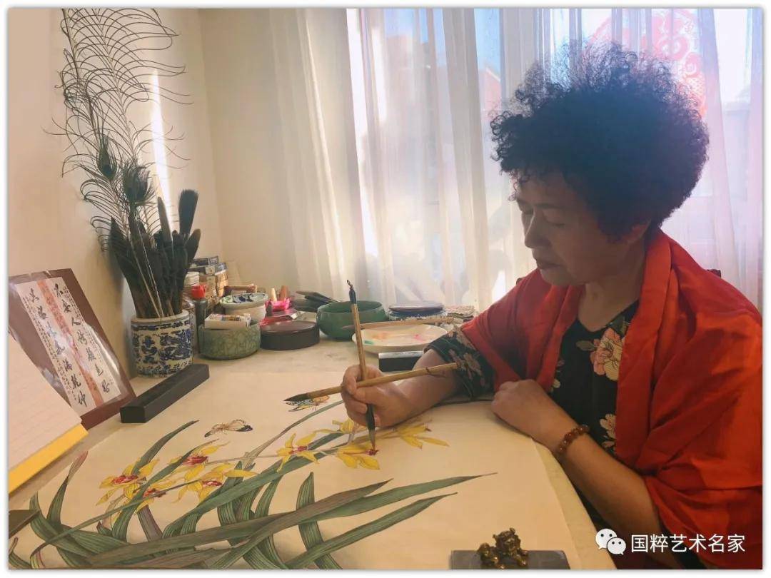 展卷细品,她笔下的花鸟,取象于平中见奇,淡中见雅,运用条幅与方形的构图,使其韵味无穷。看她的作画,很强烈的感觉到用线的流畅、柔和、霸气和俊美,时时透出一股灵气。在花与鸟之间,点缀着或黄、或青、或深、或淡的枝叶,在静与动之间,呈现出一片平静祥和的气氛。她笔下的花鸟可谓是形神兼备,栩栩如生,构思巧妙。