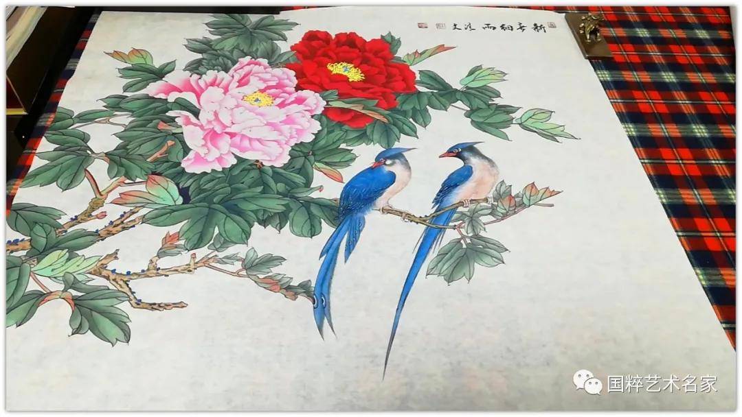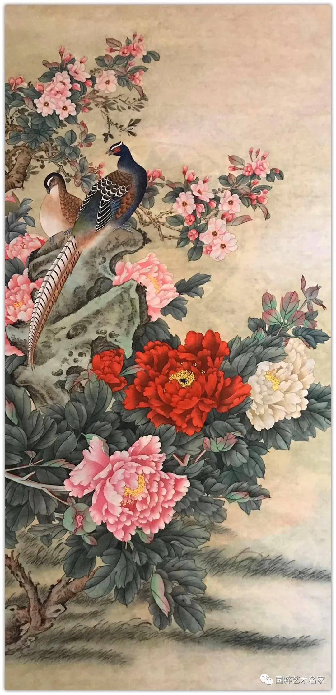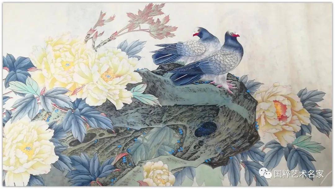 无论是工笔还是写意花鸟,色彩流丽是她创作花鸟作品的真功夫。胭脂画牡丹,艳而不俗,水墨画牡丹,最有仙子风,亦有君子品,迎风沐露,多姿丰神。又见花丛里有风来,牡丹便又有了侠者仗剑的骨气!所以她的牡丹意象,因为骨法用笔的存在,显得意象相当丰富,用不同的视角去体验画里的形神,就会得到不同的应答。一千个人的眼里,对同一幅牡丹会有一千种感受,可见他作牡丹是持开放的创作概念,绝不把“画富贵”当作唯一的范式去作拘囿!