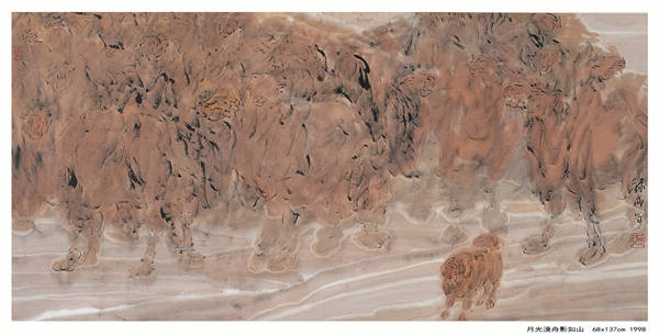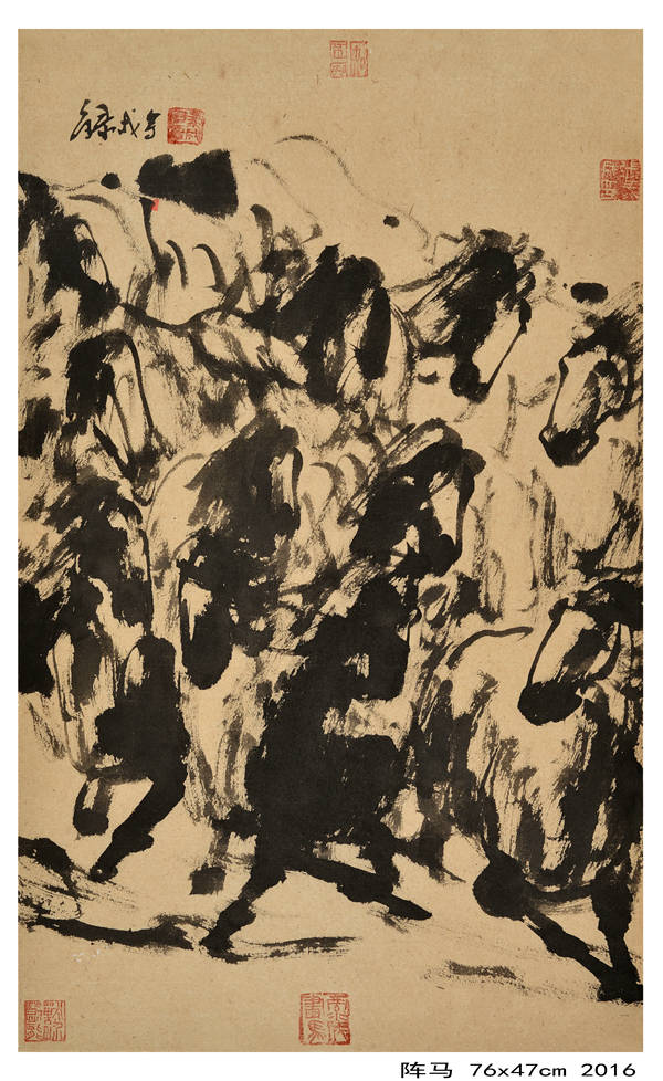 展览展出张录成作品二十余件。张录成在西域大草原工作、生活近四十载,醉享西域绘画,敬畏丝路文明。其绘画立足于书画同源的传统,追求重墨粗笔的自由抒写,以丝绸之路上的胡杨、骆驼、马、牛等为表现对象,通过对丝路文化多年来的深入研究与绘画实践,探索出表现丝绸之路苍茫、博大、雄浑、悲壮的笔墨语言。其用浓墨意笔表现群体奔涌的艺术物象,展现生命的苍劲,古今穿越的深思,展示对生活的感悟、对自然的热爱。此次展出的作品深刻反映其在传统基础上坚实的审美价值,凸显出新时代守正创新的文化自信。