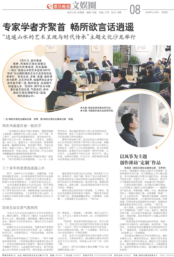 在潍坊文化沙龙活动现场,受邀专家学者围绕“逍遥山水的艺术呈现与时代传承”这一主题展开热烈讨论。大家畅所欲言,气氛空前高涨,共同探讨逍遥山水。