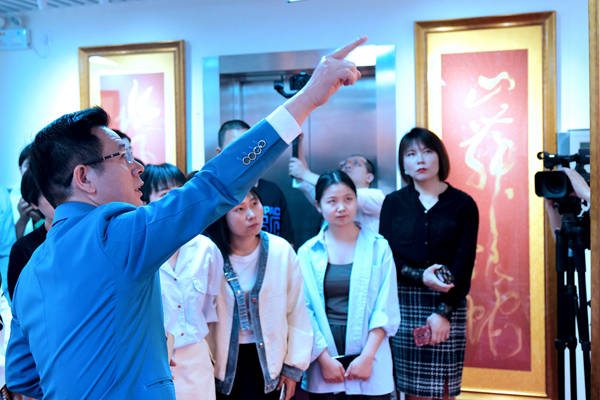 启动仪式之后,石子义先生带领现场的广大观众观展,并亲自作为讲解员一一给大家介绍了每幅书法作品及每首诗的奥妙所在。一时之间,观众云集,蜂拥相随。随后石子义先生还接受了媒体的专访。畅谈其对经营企业与艺术创作的平衡以及自身的艺术创作心得等。