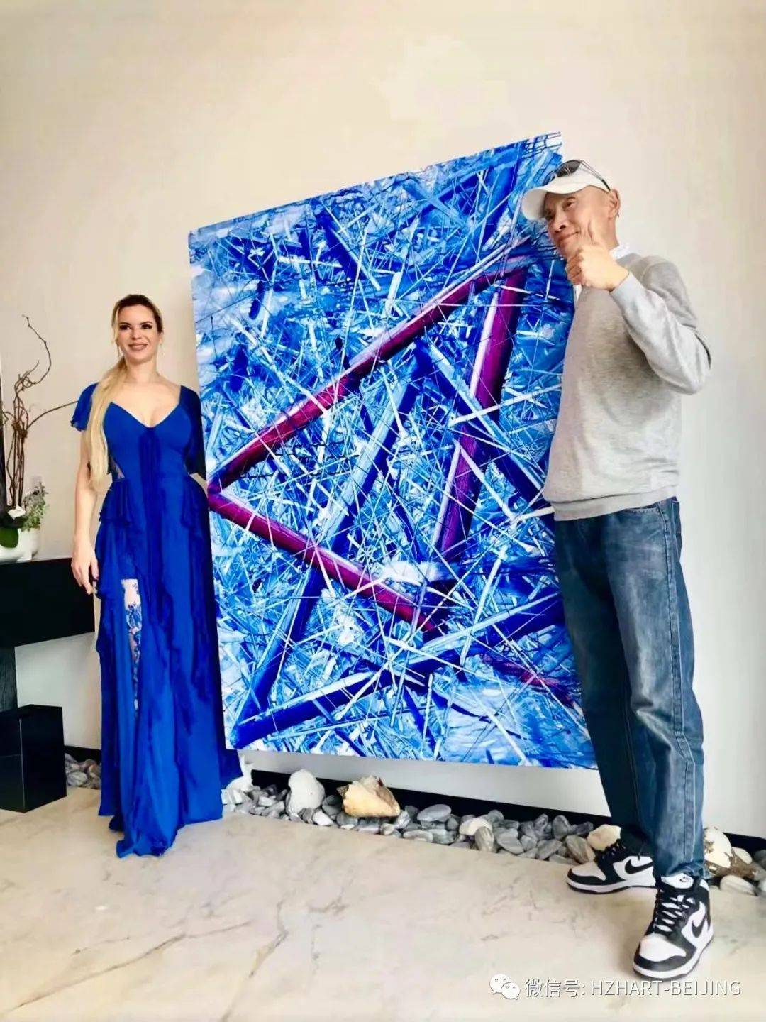 作品《蓝色与紫色三角形》被美国大收藏家马克先生和夫人克里斯汀娜所珍藏。美国时间12月12日中午朱维彬被马克先生和夫人邀请到座落于迈阿密HIBISCUSISLAND岛的家里坐客,马克先生美丽的夫人克里斯汀娜为了迎接她们非常喜爱的这件艺术品,特意换上了与作品蓝色的颜色一致的裙子和高跟鞋,表达她们对作品的喜爱及对艺术家的尊重。