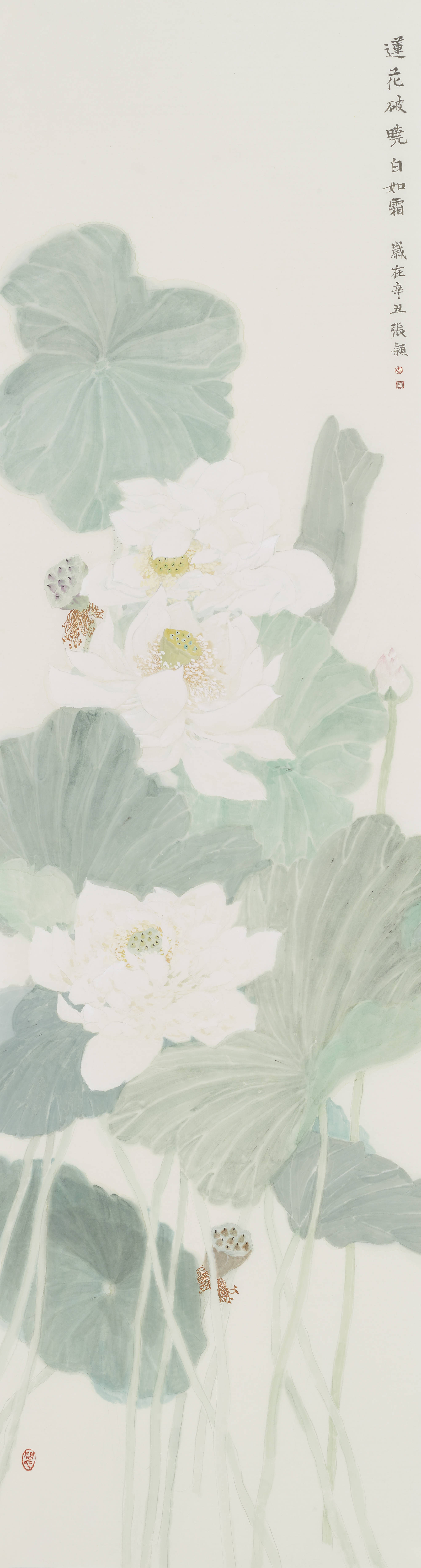 笃定的生活态度是经历丰富生活后的淬炼积淀,成熟的生命主张是一种哲学反思后的自我选择。选择本身就具备一种意义,选择什么样的而生活,选择画什么画,张颖内心非常笃定,也在淡定前行。于张颖而言,画笔已成为她雕琢生命的利器,画面就是她的立场,那些真切而丰满的心灵感知,那些谐趣而理性的图像塑造,抵过任何华丽的词藻。对张颖而言,她的作品不是现实荷花样态纤毫毕现的模拟,而是对其契合内心追求的追溯,淡定面对时光在那些花叶茎间的流逝,显出人性伟大的张力。