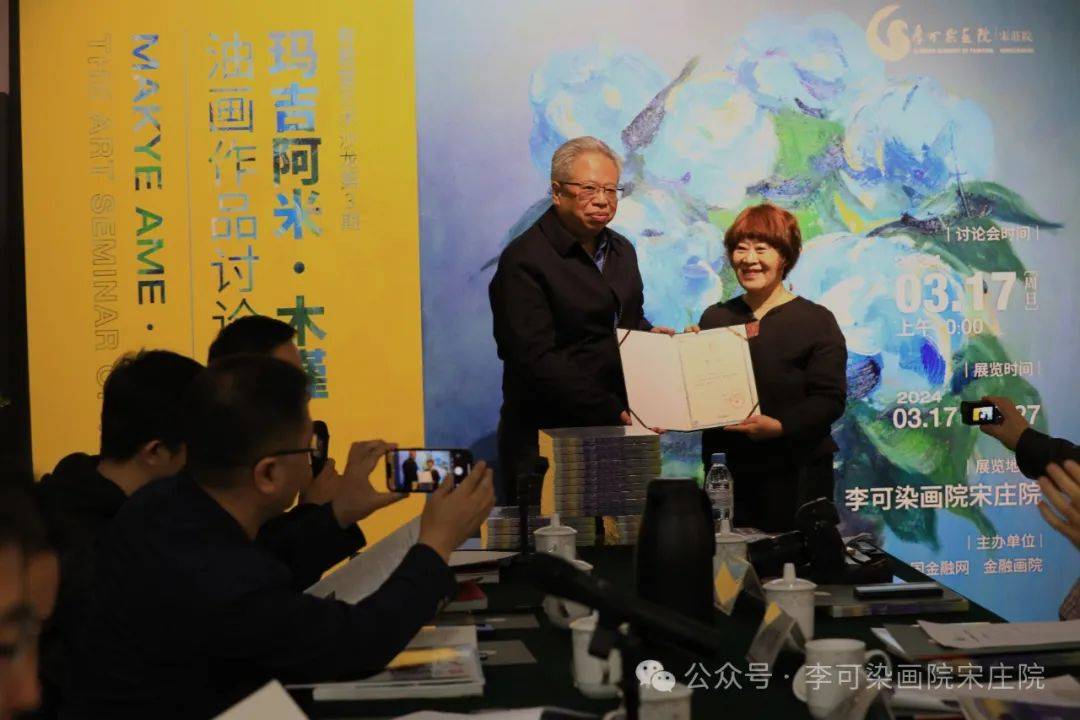 揭幕仪式上,玛吉阿米·木槿还被聘任为李可染画院研究员。中国文艺评论家协会理事、艺术产业研究委员会主任,中国艺术经济研究院院长西沐代表李可染画院为艺术家颁发了聘书。新书揭幕仪式由李可染画院副院长兼宋庄院院长史跃峰主持。