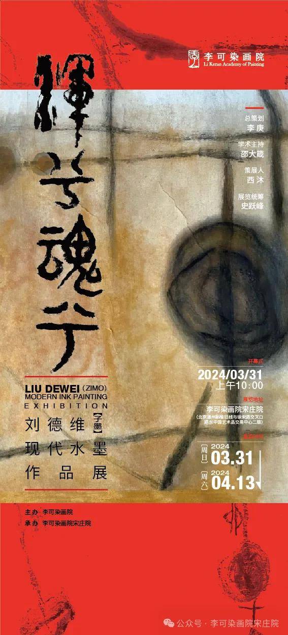 由李可染画院主办的“浑兮魂兮”刘德维(子墨)当代水墨作品展将于2024年3月31日上午在李可染画院宋庄院开幕。本次展览由李可染画院院长李庚教授担任总策划,美术史学家、美术评论家邵大箴教授担任学术主持,中国文艺评论家协会创会理事、中国艺术经济研究院院长西沐教授担任策展人。本次展览将展出刘德维(子墨)先生近年来创作的、具有代表性的当代水墨作品70余幅。
